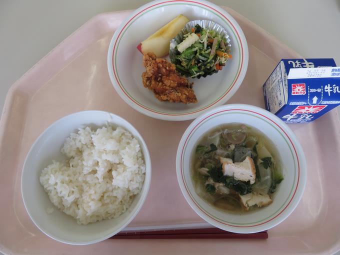 A献立 ご飯、鶏のオニオン風味揚げ、和風みそサラダ、芋煮汁、りんご