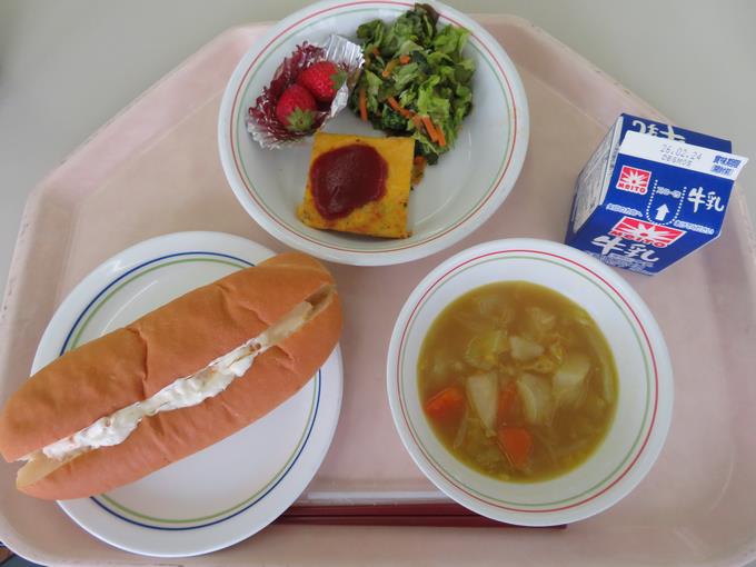 B献立 オレンジクリームコッペサンド、しらす干しオムレツ、ブロッコリーのサラダ、野菜のスープ煮、いちご