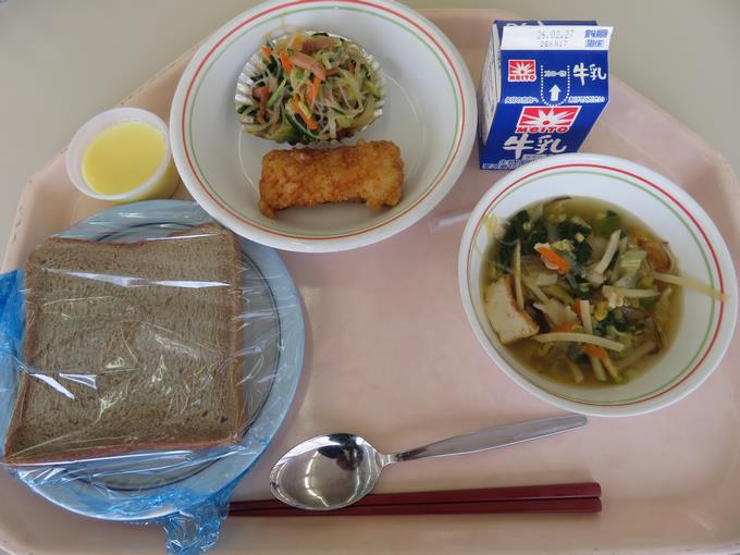 B献立 ミルクロール、くじらの竜田揚げ、ごま酢あえ、野菜スープ、ヨーグルト