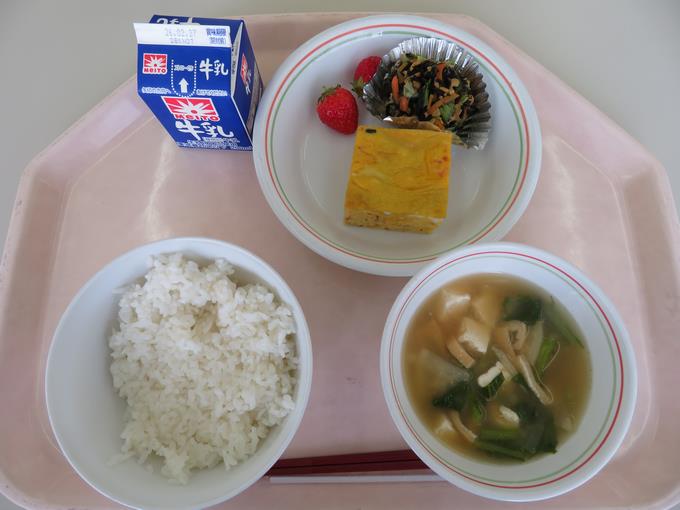 A献立 ご飯、具だくさん厚焼き卵、ひじき入り納豆和え、かぶのみそ汁、いちご