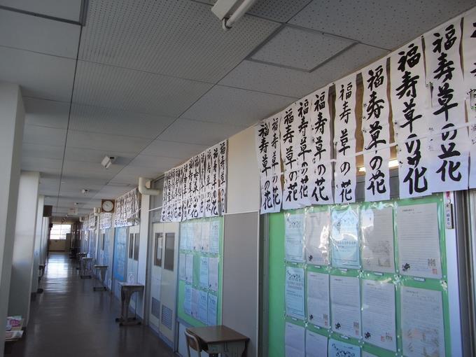 冬休みの課題として国語科から書き初めの課題が出ました。各学年クラスの廊下にて掲示しています。