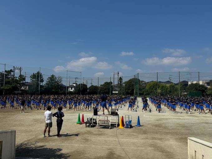 まだまだ残暑が厳しい日が続いておりますが、グラウンドでは運動会本番に向けた練習に一層熱気が増してきました。 今日は第1回目の全校練習が行われ、全校生徒がグラウンドに集まりました。練習では、準備運動をはじめ、各色の待機場所への移動確認、そして各色に分かれての決起集会などが行われました。準備運動では、生徒たちの大きな掛け声がグラウンドに響き渡り、生徒たちがもつエネルギーを感じることができました。また、今回の練習で印象的だったのは、教員が細かく指示を出す場面が全くなく、実行委員や3年生がリーダーシップを発揮して、自主的に練習を運営していたことです。リーダーたちの指示に一人ひとりがしっかりと呼応し、きびきびと動くその姿も大変素晴らしかったです。今後の練習を通して、このチームとしての一体感がさらに洗練されていくかと思うと、本番までの成長が今からとても楽しみです。