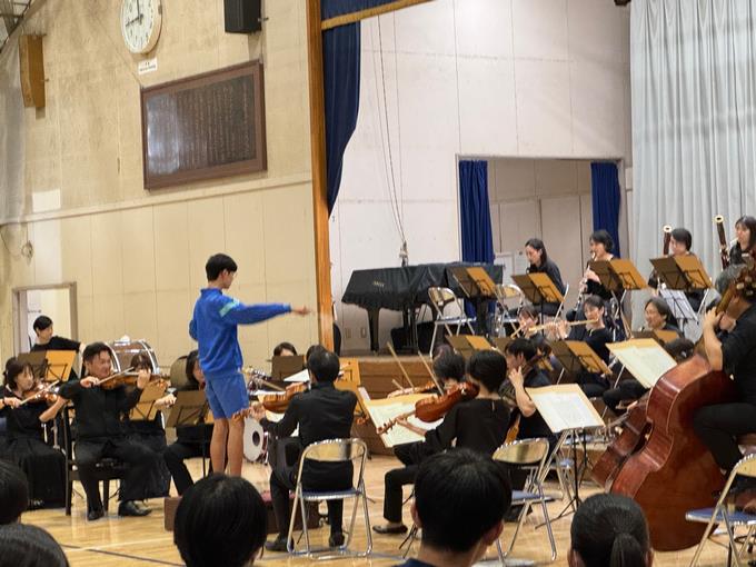 本日、千葉交響楽団の皆さんをお招きし、音楽鑑賞教室を実施しました。千葉県が誇るプロのオーケストラによる生の演奏を体育館で間近に鑑賞するという、大変貴重な機会となりました。プログラムは、生徒たちのために音楽の教科書にも載っている有名なクラシック音楽の中から、バロック派、古典派、ロマン派と、時代ごとの特徴がわかるよう名曲をピックアップして演奏してくださいました。また、オーケストラの楽器紹介や、それぞれのセクションごとのアンサンブルも披露され、楽器の音色や仕組みへの理解を深めることができました。指揮者体験コーナーの企画では、各学年の代表者が実際の指揮棒を手にし、オーケストラの皆さんとハンガリー舞曲第5番を演奏しました。その堂々たる指揮ぶりに指揮者の先生も驚かれていました。生徒たちは合唱祭のクラス合唱指揮者ということでしたが、本物のオーケストラ相手に指揮をする初めての経験に、「合唱とは違っていろんな楽器の音がするからまとめるのが大変!」など、感想を述べていました。「普段はあまりクラシックやオーケストラを聴かない」という人も少なくないと思いますが、自分の関心ごと以外にも、様々な世界を知ったり、多様な文化芸術に触れたりして、自身の感性を豊かにしていくことや世界を広げていくことの大切さを改めて感じました。千葉交響楽団の皆様、心に響く素晴らしい演奏を本当にありがとうございました。