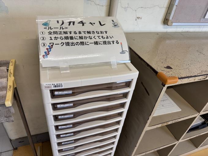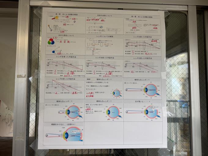 1年生の教室付近の廊下には、学習のヒントになるような掲示物やミニ実験道具が設置されていました。特に目を引いたのは、光の屈折について、図や分かりやすい言葉でまとめられた掲示物です。生徒たちは、給食の整列時や休み時間など、ふと目を止めた時に内容を確認することができます。日常の何気ない瞬間に、学習内容に触れられる工夫は大変効果的です。また、単元や進度別に分けられたプリントを自由に取って使用できる棚が置かれていたことも印象的でした。「もっと学びたい」「もう一度確認したい」という生徒の自発的な学びの意欲に応え、「学びたいときに学ぶことができる」環境が整えられていることがとても素敵だなと感じました。