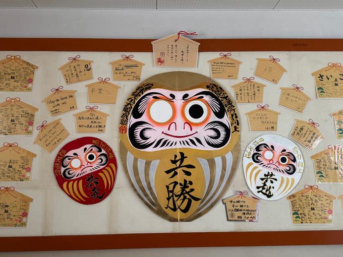 本日から公立高校の入試が始まりました。3年生の教室近くの廊下には、学年スローガンである「共勝」の文字が力強く書かれた、大きなだるまが掲示されています。そして その周りには、校長をはじめ、学年の先生方からの熱いエールや、各クラスの仲間たちの思いが込められた寄せ書きの絵馬が飾られています。自分の目標に向かって、ひたむきに努力を重ねてきた3年生。 どうかこれまでの努力に自信を持ち、持てる力を存分に発揮してきてほしいと願っています。頑張れ、3年生!