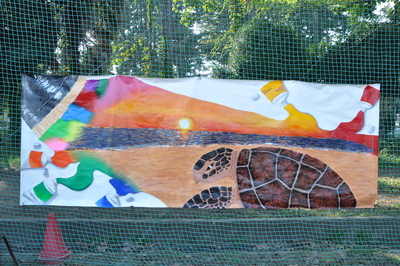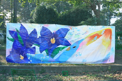 美術部が体育祭の成功を祈願し描き上げた、「レインボークジラ」と「うみがめ」です。