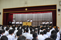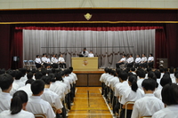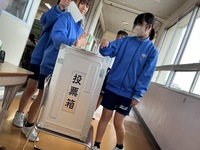 3日(金曜日)(5)(6)時間目に体育館にて生徒会本部役員立会演説会が行われました。学校のリーダーとして1・2年生から7名の立候補者が、全校生徒の前で立派に「高根台中学校をどうしたいのか」を具体的に演説で話すことができていました。選挙期間中、立候補者を一番近くで支えていた推薦責任者も立派に役目を果たしていました。今年度の選挙は、信任投票となりましたが投票の結果、立候補者全員が信任されました。今回投票で使用した投票箱は船橋市の選挙管理委員会から借用した、実際の選挙で使用されるものでした。本物に触れるいい機会となりました。今回信任された7名は、17日の前期終業式後に行われる任命式を経て、新生徒会本部役員の活動がスタートします。