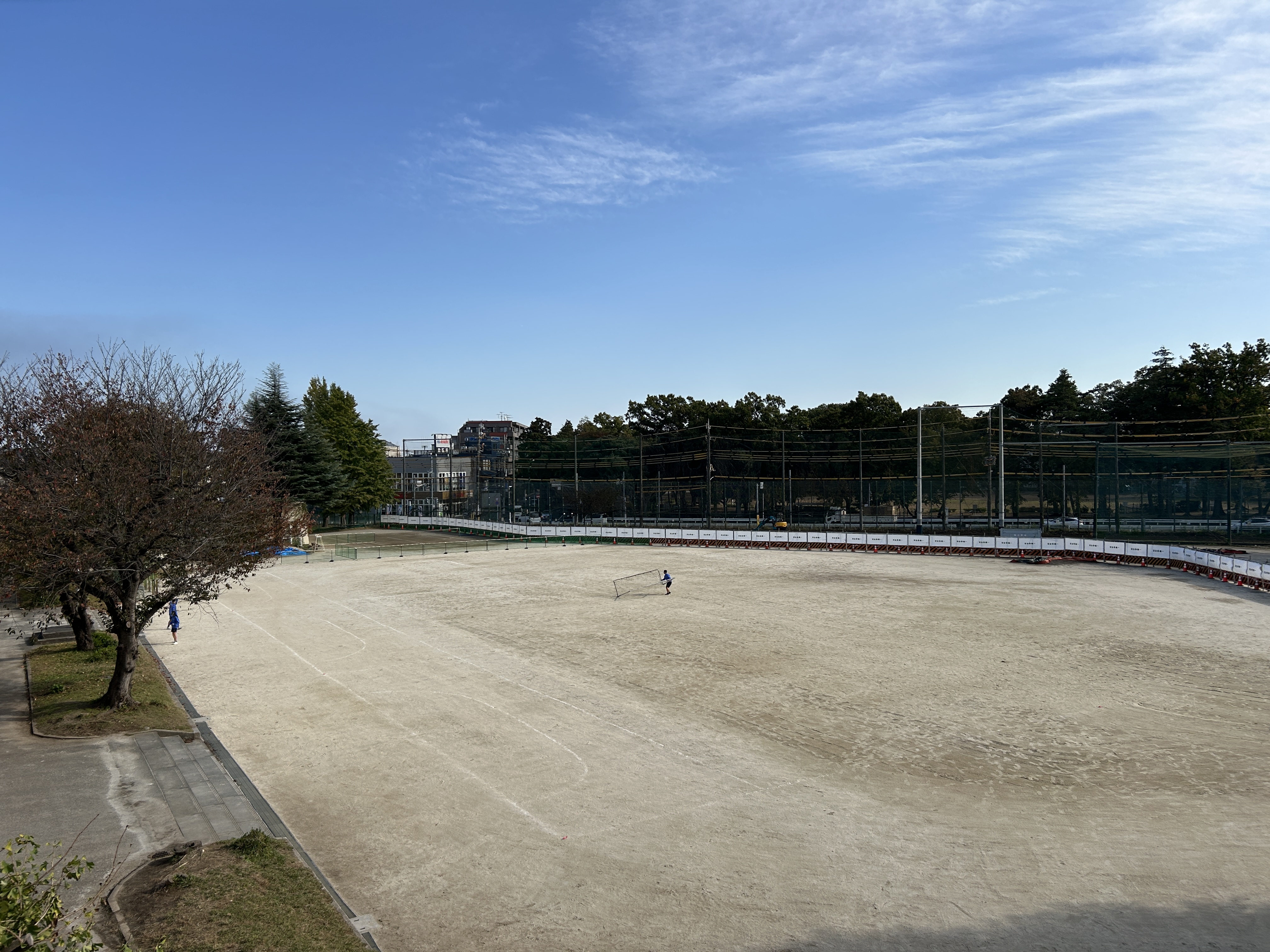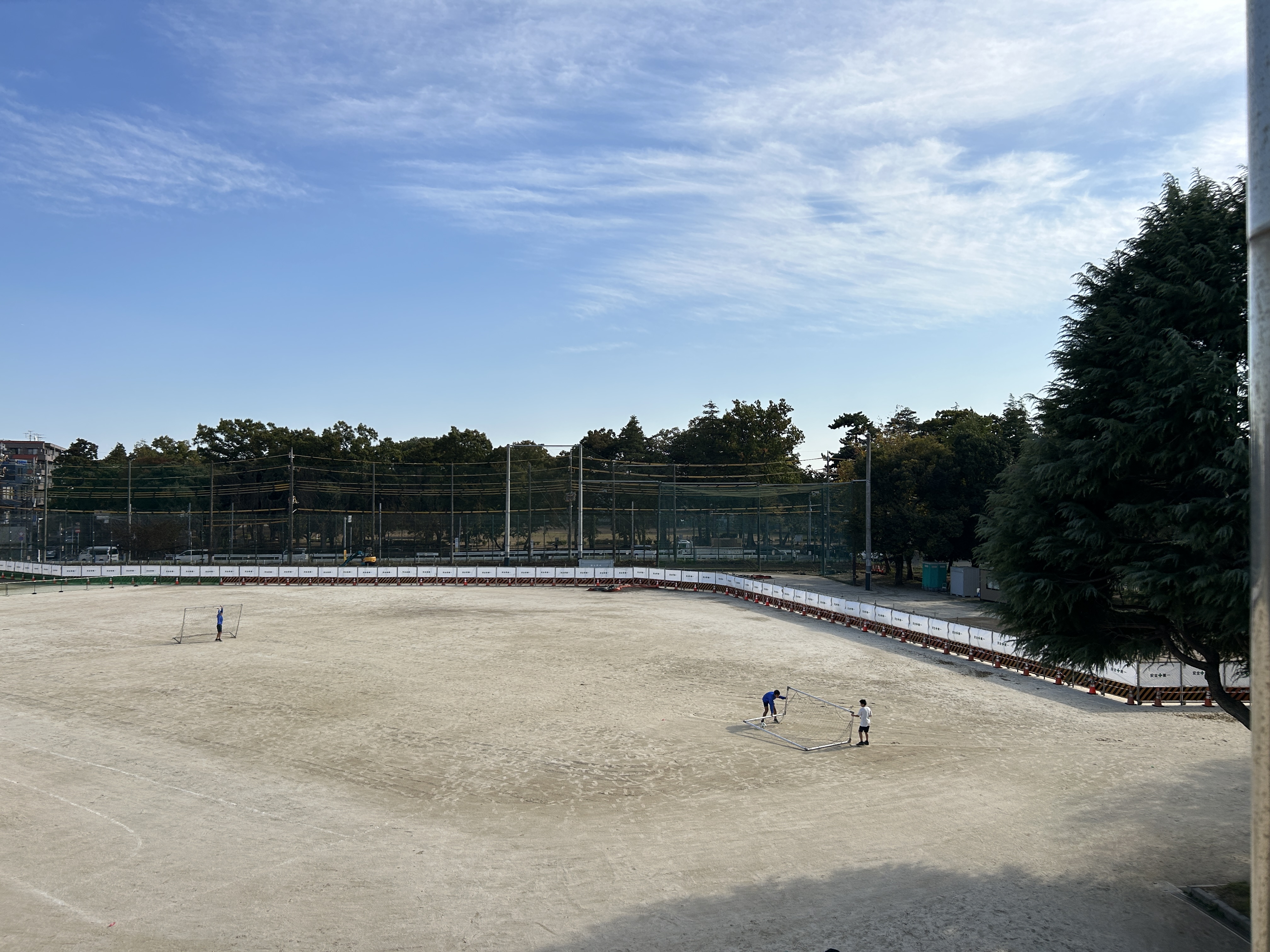 10月の中旬から「交差点改良工事に伴う学校施設等移設工事」が行われています。校庭にフェンスが立ち手狭さが感じられます。フェンスの先では伐採伐根作業が行われ、大きな樹木がほとんどなくなってきました。来週からはフェンス、防球ネット撤去作業に入るそうです。歩道側を歩く際はお気を付けください。