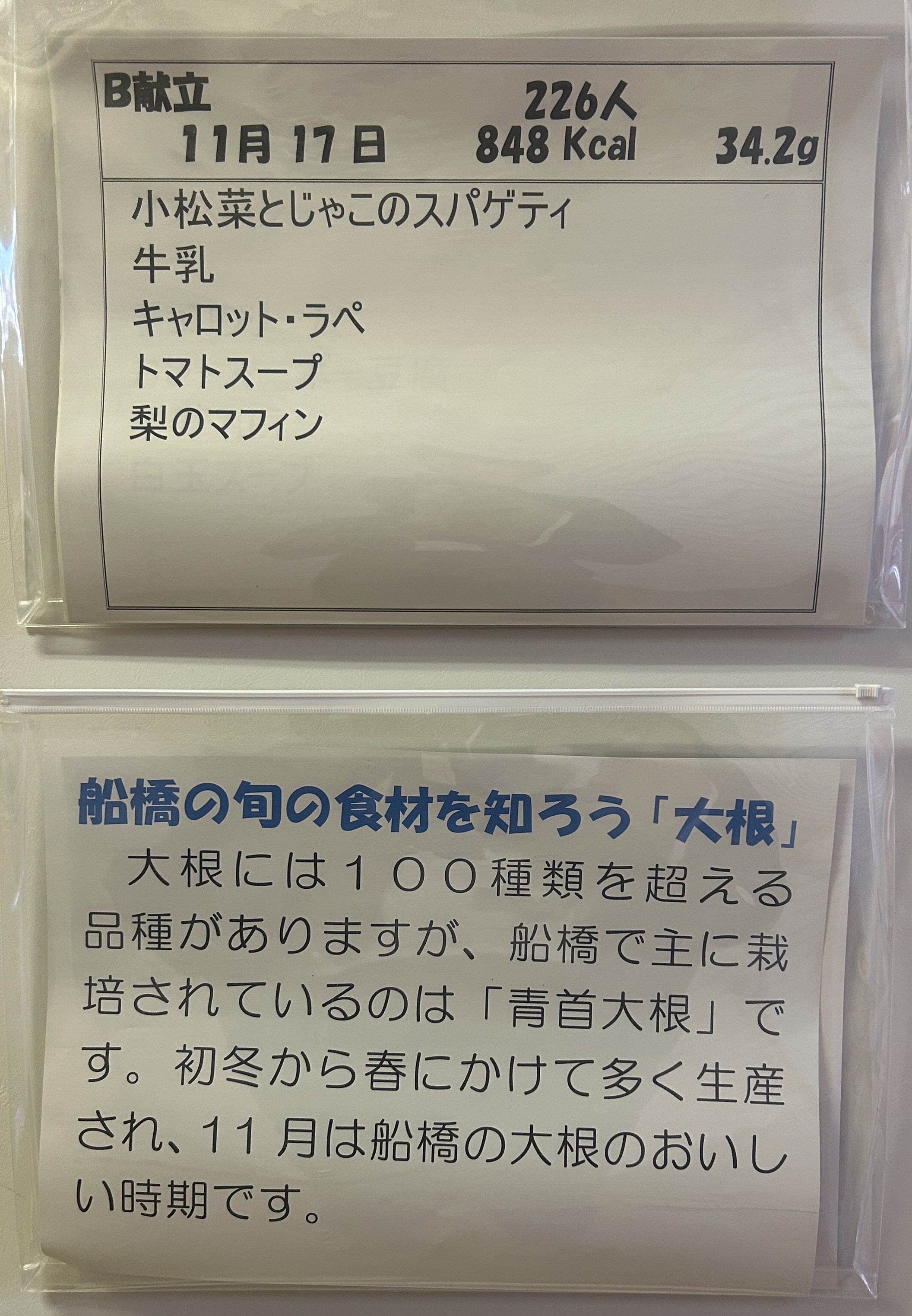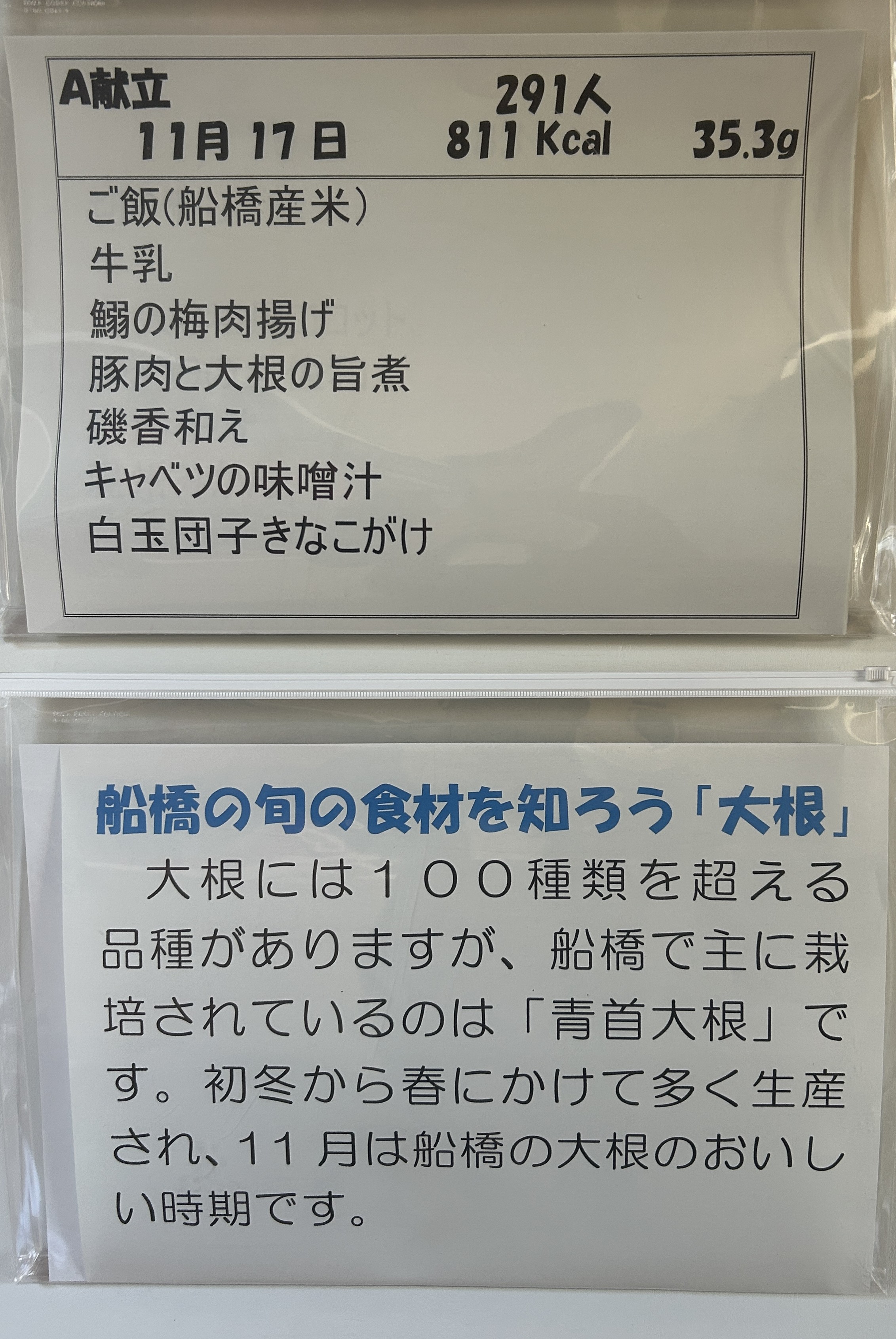 本日の献立では、船橋産の米や海苔、大根、小松菜、梨や、千葉県産の鰯、きゅうり、キャベツがふんだんに使用されていました。