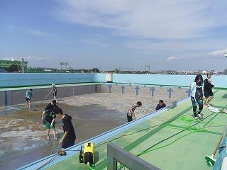 11日(火曜日)、昨日までのはっきりしない天気とは打って変わり、強い日差しの下で職員によるプール清掃を行いました。1年分の汚れはなかなか手ごわいようで、ブラシを持つ手にも力が入っていました。
