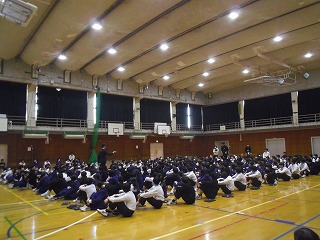 19日(木曜日)、1年生が学年集会を行いました。12月ではありますが、今年設置されたエアコンのおかげで、寒さに耐えながらの集会というイメージではありませんでした。