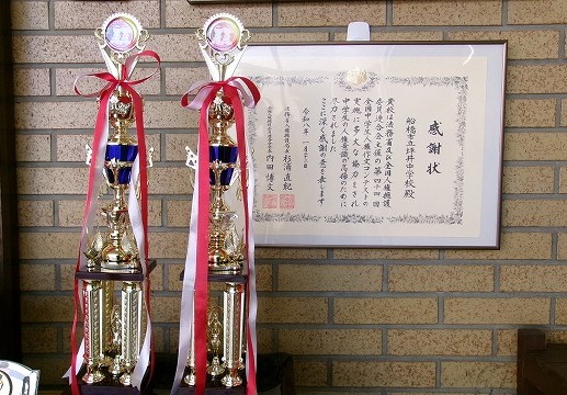 人権教育感謝状 手前左は駅伝フェスティバルの優勝トロフィー