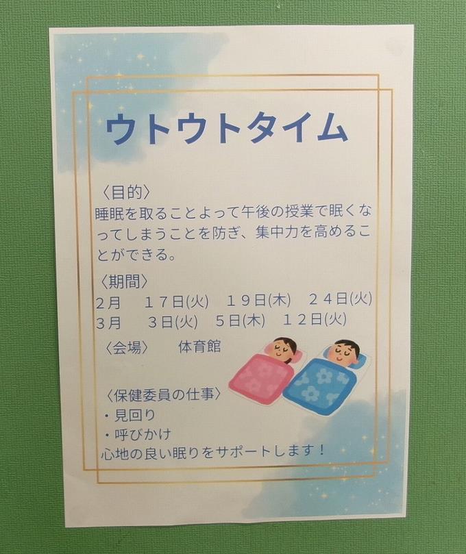 3年生の発案により始まった『ウトウトタイム』が、アンケートや保健委員会での話し合いを経て延長実施されることになりました。昼休みの短い時間ですが、心と体を休め、午後の活動のためにリフレッシュすることができるといいですね。