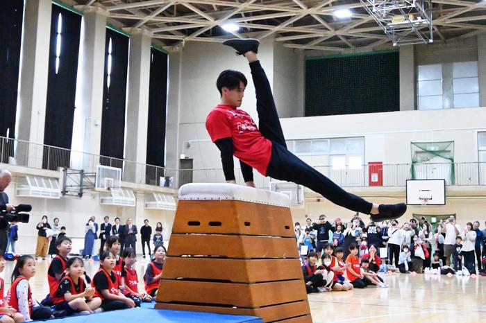 教室の最後には、連続バック転や跳び箱を使ったあん馬の回転技など、世界トップの技を子どもたちの目の前で披露し、大きな拍手がわき起こりました。