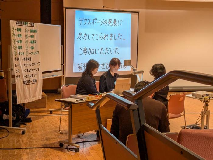 講演会では、村井監督がデフリンピックを振り返るなかで、デフバレーの選手たちへ「応援してくださる方々に、戦う姿を通して感動させられる選手になろう」と呼びかけ、試合に勝利して歓喜の雄たけびをあげる選手の様子を動画で鑑賞しました。参加者の中には、選手の姿に涙する方もおり、大いに盛り上がった講演会となりました。