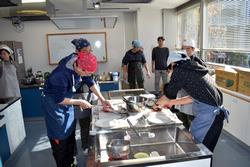 底びき網漁業ではホンビノスガイやスズキ、コノシロ、トラフグ、コウイカ(シリヤケイカ)等が獲れました。港に戻ってから、浜町公民館の調理室へ移動し、市内の農水産物を活用した食育活動を行っている料理研究家の金子光夫先生の教えを受けながら参加者はスズキを捌き、ムニエルやあら汁等を作りました。魚を普段捌かないという方も多く、料理教室は初開催ながら大変好評でした。