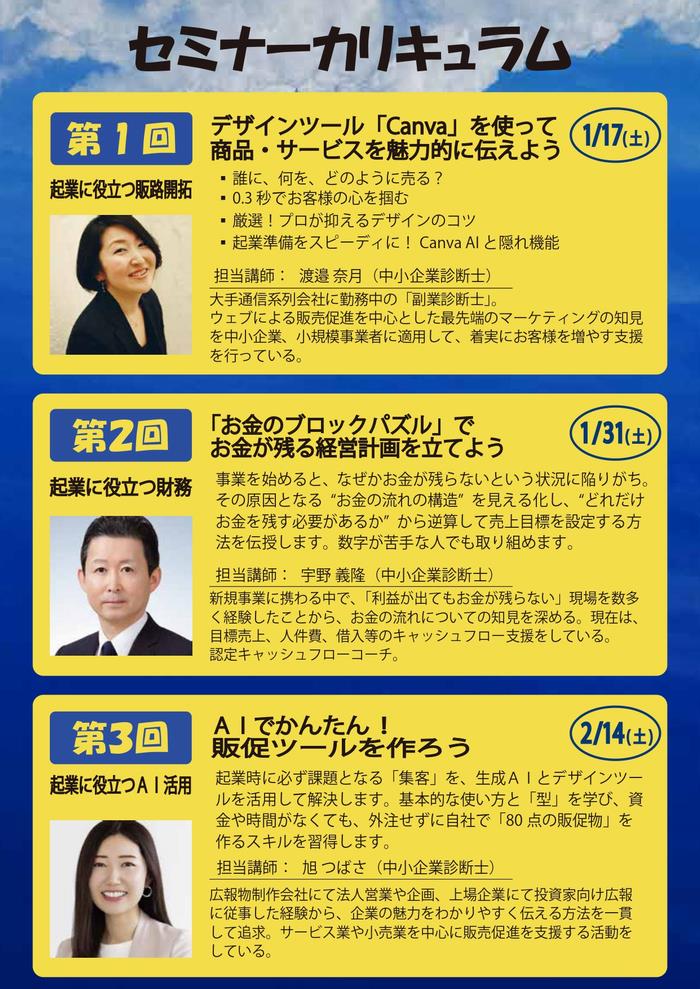 特定創業支援等事業(ふなばし起業スクール等)の発展講座として、3つのテーマでオンラインセミナーを実施します!