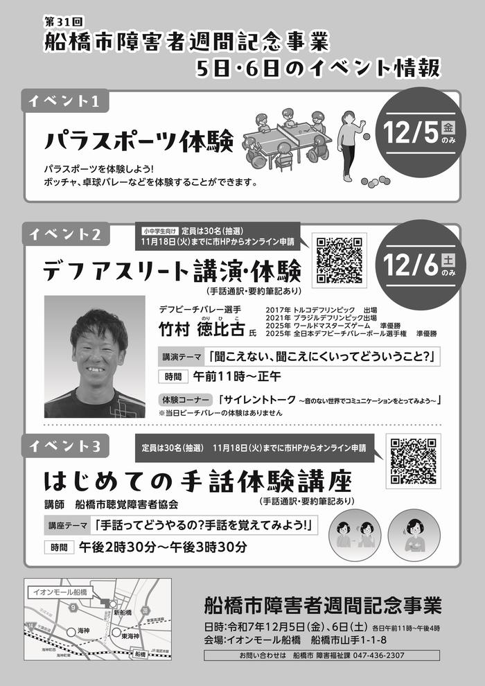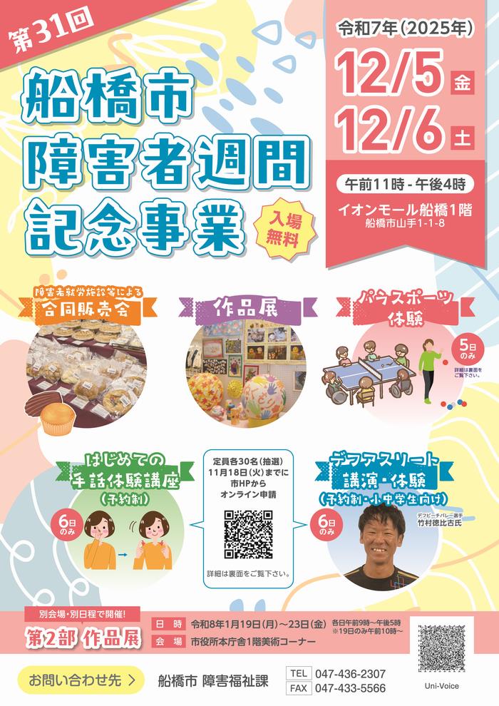 市民の皆さんに障害に関する理解を深めていただき、障害のある方たちの社会参加を進めることを目的に、毎年、障害者週間記念事業を実施しています。今年は12月5日(金曜日)、12月6日(土曜日)にイオンモール船橋で開催します。