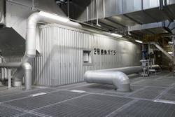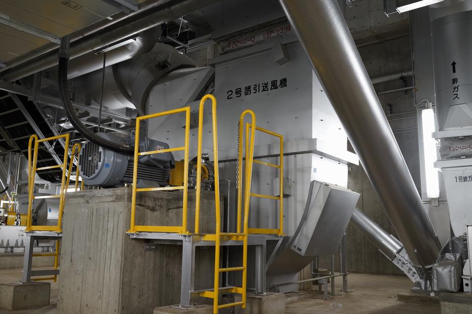 集じん装置を通った排気ガスは、誘引送風機により排ガス加熱器、触媒脱硝装置、そして煙突へと送られていきます。