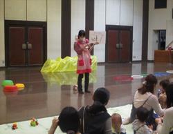 乳幼児親子対象“ぽかぽか広場”では音楽に合わせて一緒に体を動かしたり、ふわふわ素材のシフォン布を使ってわらべうた遊びをしたりしました。