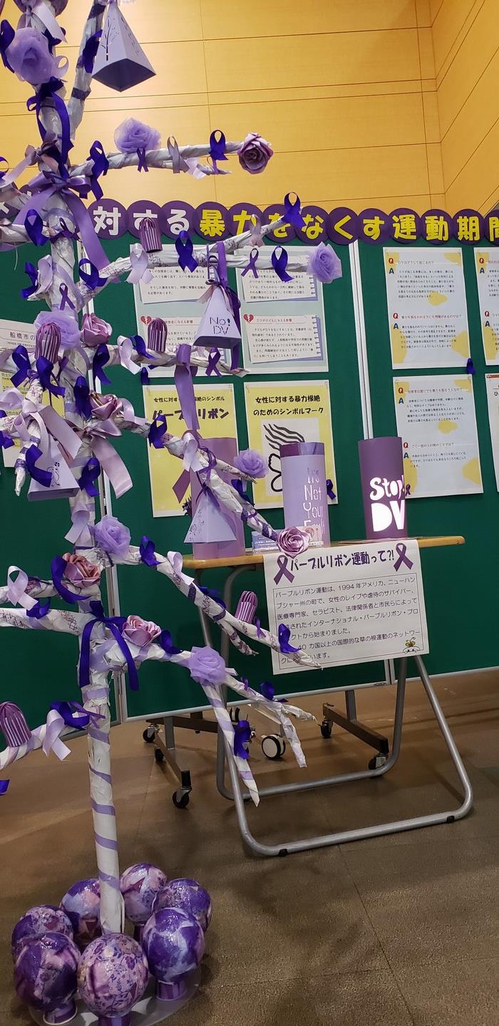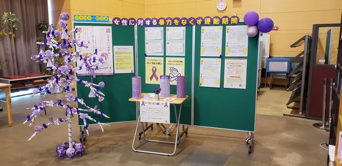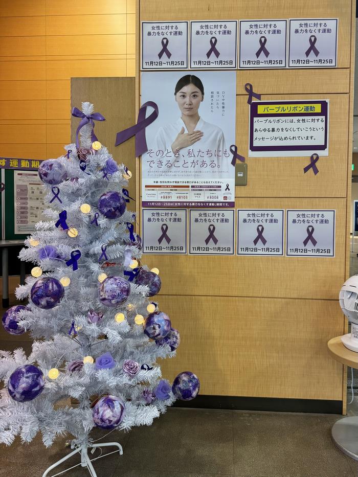 女性に対する暴力根絶のシンボルであるパープルリボンにちなんで、男女共同参画センターをパープル・ライトアップを模した装飾で彩ります。