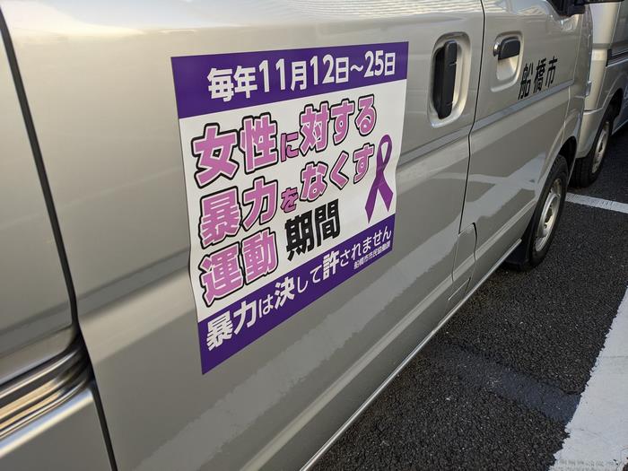 公用車にマグネットシートを貼り、女性に対する暴力をなくす運動期間の周知を行っています。