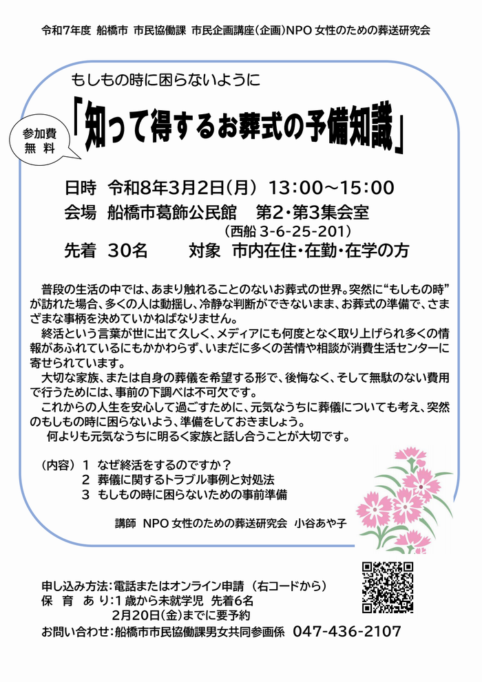 - 【市民企画講座】「知って得するお葬式の予備知識」を開催します