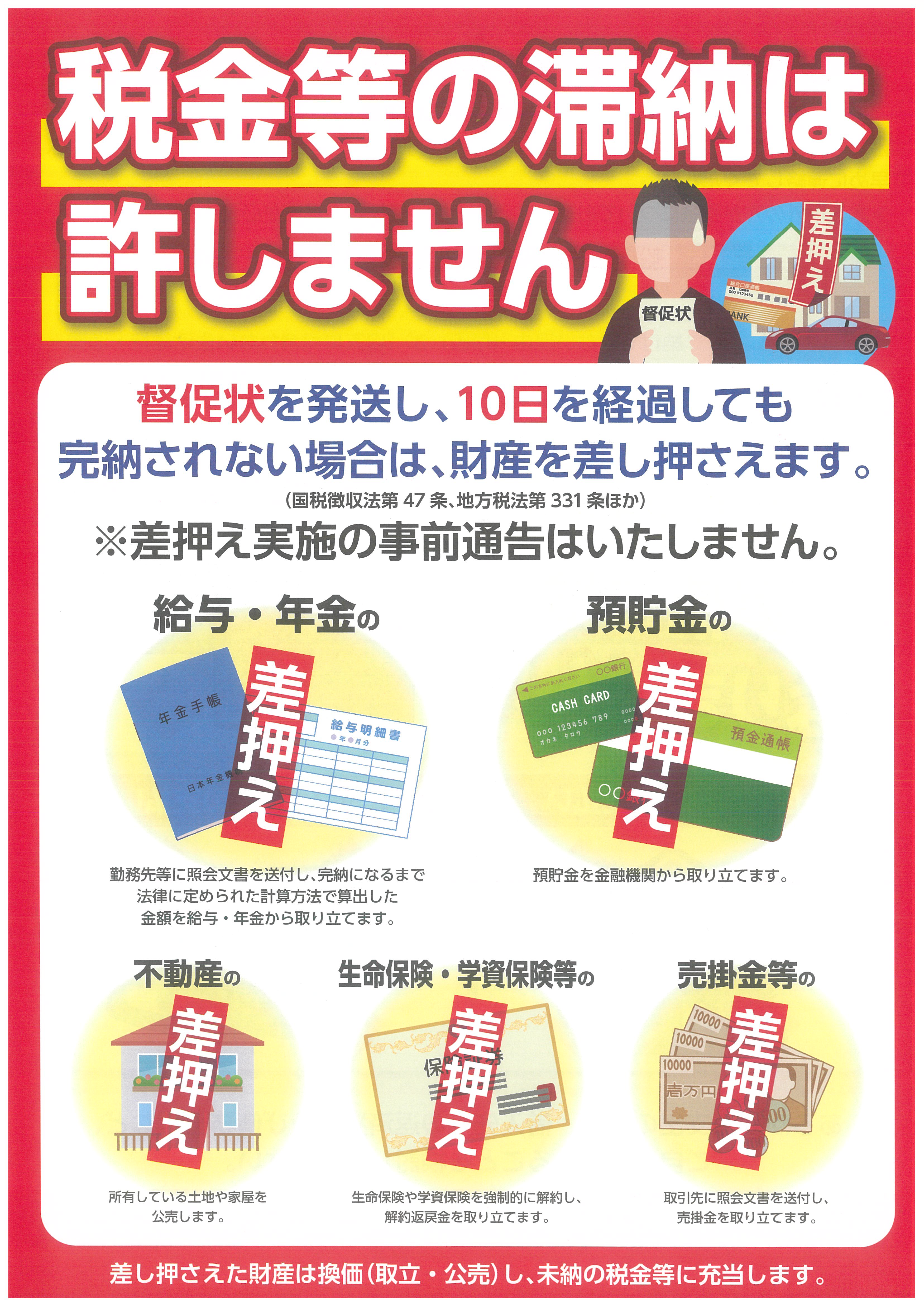 千葉県と県内全54市町村は10月から12月を「千葉県下一斉 滞納整理強化期間」として、市町村税・県税の滞納者に対する徴収対策(文書催告、勤務先・取引先への財産調査、給与・預貯金・生命保険の差し押さえ)を強化しています。