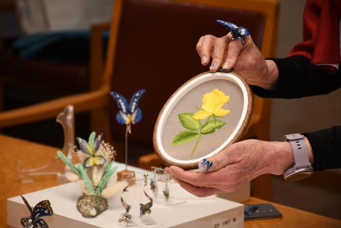 北井氏の作品は令和6年度からふるさと納税の返礼品になっており、立体刺繍の蝶やイヤリング、ブローチ&ネックストラップ等が出品されています。