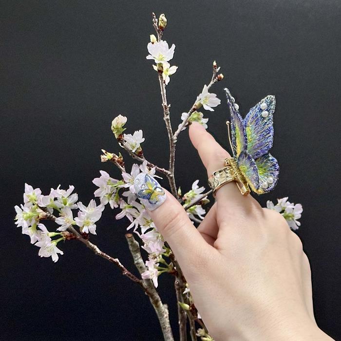 こちらは北井氏が船橋市をイメージし作成した、パープルブルー色がメインの「立体刺繍の蝶(パープルグリーン蝶)」です。