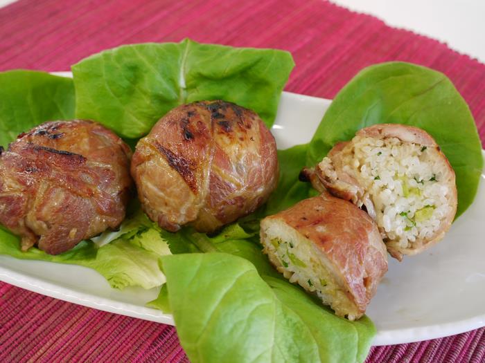 | 1.肉巻きおにぎり | 2.小松菜スープ |