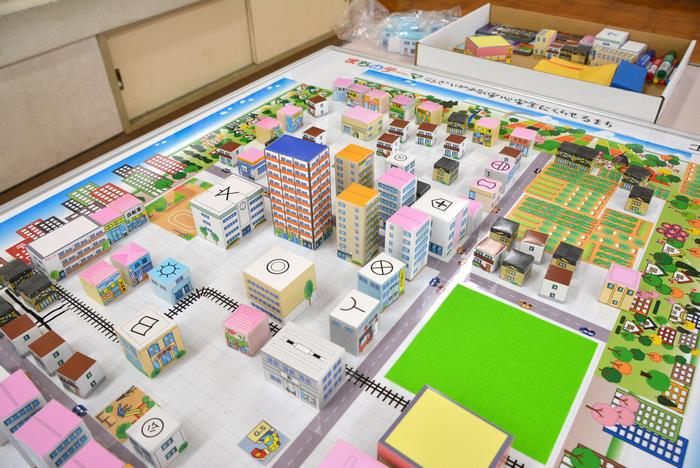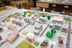 自由な発想でまちづくりができるよう、たくさんの模型や背景図を用意しています。