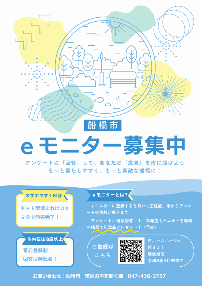 eモニターの趣旨や登録資格等は、「船橋市eモニター実施要領」に定めております。