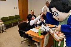 市長から市長室全体の案内と市長室でどのような執務を行っているかについて説明がありました。その後、1人ずつ市長の椅子に座り、市長や「目利き番頭ふなえもん」と一緒に記念撮影を行いました。代表生徒の皆さんは、市長の説明に熱心に耳を傾け、めったに入ることができない市長室に興味津々の様子でした。