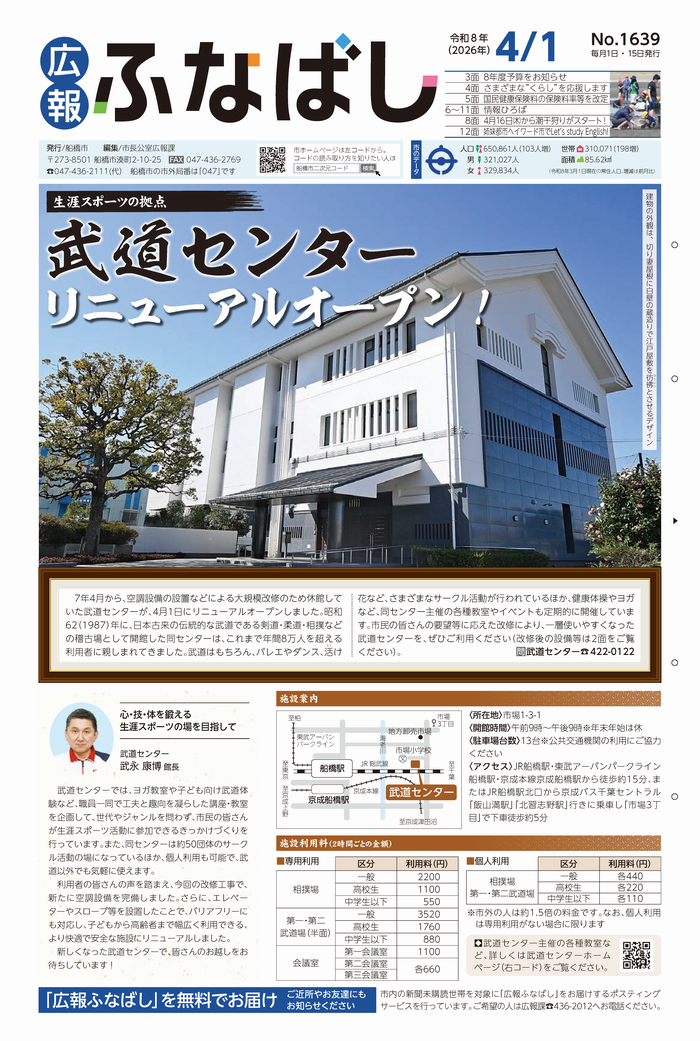 | 1面 | 生涯スポーツの拠点 武道センターがリニューアルオープン! 「広報ふなばし」を無料でお届け ご近所やお友達にもお知らせください |