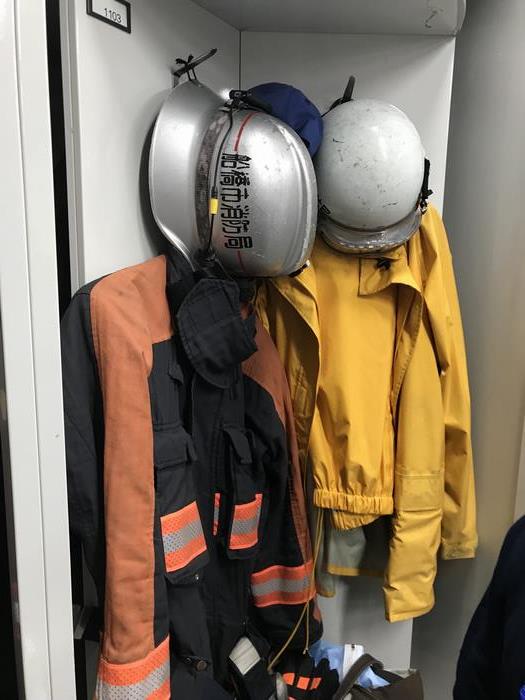 その他にも仮眠室やトレーニング室などがあり、中でも1番すごいと思ったのが出動準備室です。ここには回転式ロッカーがあり、それぞれの隊員の防火着が収納されています。さらに驚いたのが、消防隊員さんは、防火着を約30秒で着ることができるということと、食堂と仮眠室、消防車などが車庫につながっているということです。防火着はたくさんの金具がついていて、私なら着るだけで30分位かかりそうなのに、すごいと思いました。また、消防署の中にいればどこからでも出動準備に入れるという仕組みから、いつ火災があっても迅速に対応することができるということがわかりました。
