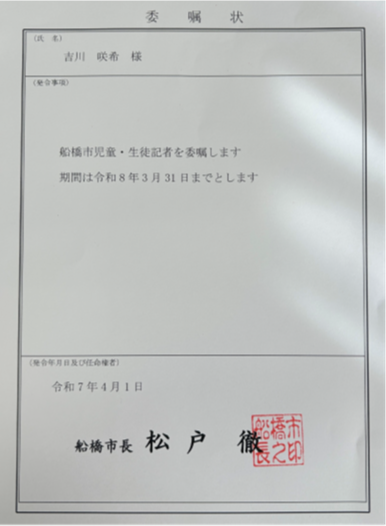 私はこの1年間児童記者をやって、自分でも知らなかった船橋の魅力をたくさん知ることができ、船橋がもっと好きになりました。少しでも船橋の魅力、そして習一小の魅力が伝わっていれば嬉しいです。この1年間、たくさんの方に協力してもらい、記事を書くことができてとても良い経験になりました。すごく楽しかったです。