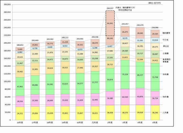 令和5年度の一般会計の歳出決算額は2,340億8,574万円で、前年度の決算額から2.7%の減となりました。