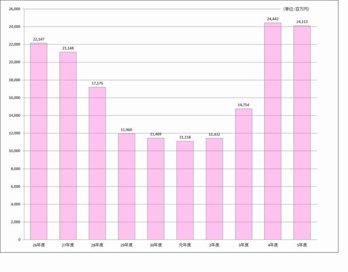 | 普通建設事業費 | 14,412,306 | 6.2 | 12,105,865 | 5.0 | 2,306,441 | 19.1 | 学校や公園、道路などの公共施設や都市基盤の整備などにかかるお金 |