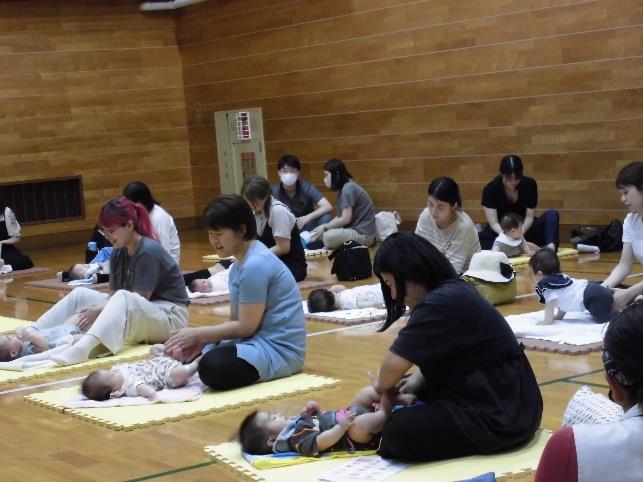 6月7日(金曜日)に助産師による2~8か月の0歳の親子向けのベビーマッサージと、9か月~1歳6か月の親子向けにベビービクスの教室を行いました。