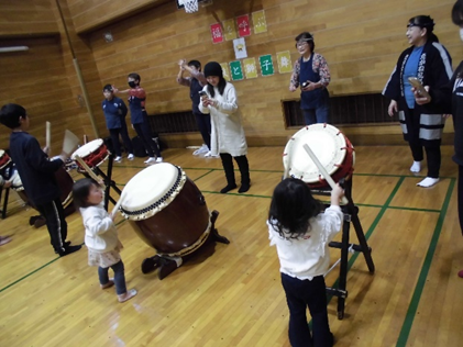 参加した小学生、幼児親子は迫力ある和太鼓や笛の音に聴き入り、実際に太鼓を体験し、頭を噛んでもらうなど縁起の良いお正月気分を楽しみました。