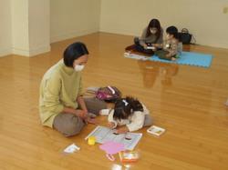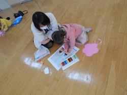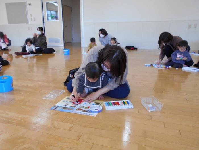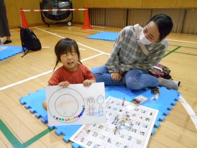 お母さんのおひざの上に乗り触れ合って遊んだり、紙のお皿に好きな食べ物をいっぱい描きました。