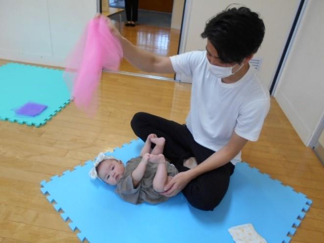 布を使ったわらべうたあそびを楽しんだり、曲に合わせて「たかいたかい」をしてもらい、赤ちゃんたちもニッコニコ♪