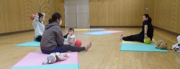 ファミリーでご参加の方もおり、子どもを膝に抱きながらストレッチをしたり、ボールを使って色々な運動をしたりしました。