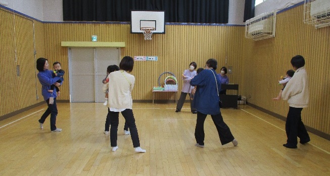 軽快なリズムの音楽に合わせて歩いたり、小走りしたり、ジャンプしたり、親子で一緒に体を動かしました。