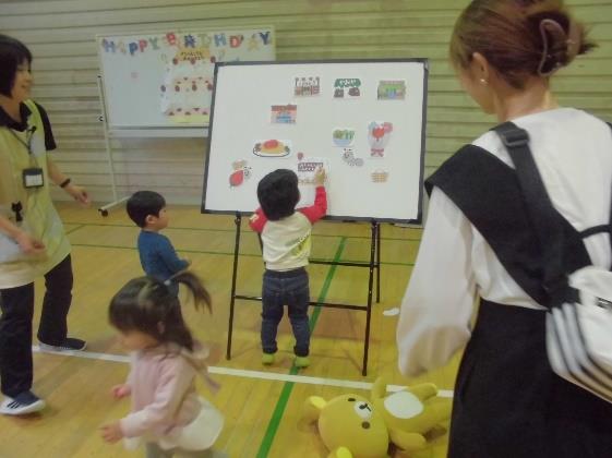 絵本を読んだり、バースデーのエプロンシアターを見た後は、みんなでケーキに飾り付けをしました。