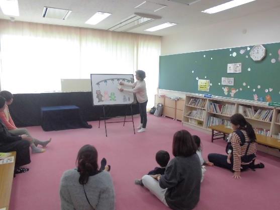 かわいいクマさんの人形劇やたぬきさんがタイコのコンテストの練習をする仕掛けあそび、動物がたくさん出てくるパネルシアターなどなど、楽しいおはなしがいっぱいでした。