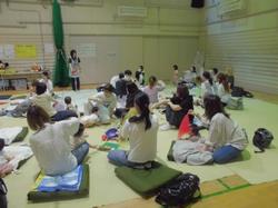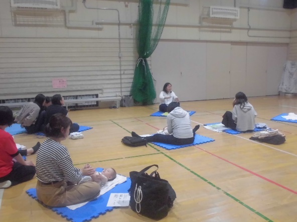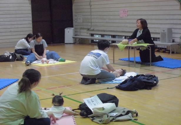 宮本第一保育園の看護師さんが来館し、救急法のミニ講座や赤ちゃん人形を持ってきてくれて、誤飲と窒息と睡眠時、熱性けいれんなど、いざという時の対応を実際に見せてくれました。