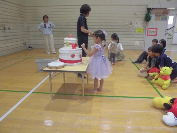 楽器を使ってお誕生月のお友達をみんなでお祝いして、みんなでろうそくの火をフ~っと吹き消しました。