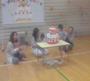 大きなバースデーケーキを囲んで、「ハッピーバースデー」の曲に合わせてタンバリンを鳴らしたり、お誕生日のお友だちに「おめでとう!!」と拍手をしてお祝いをしました。